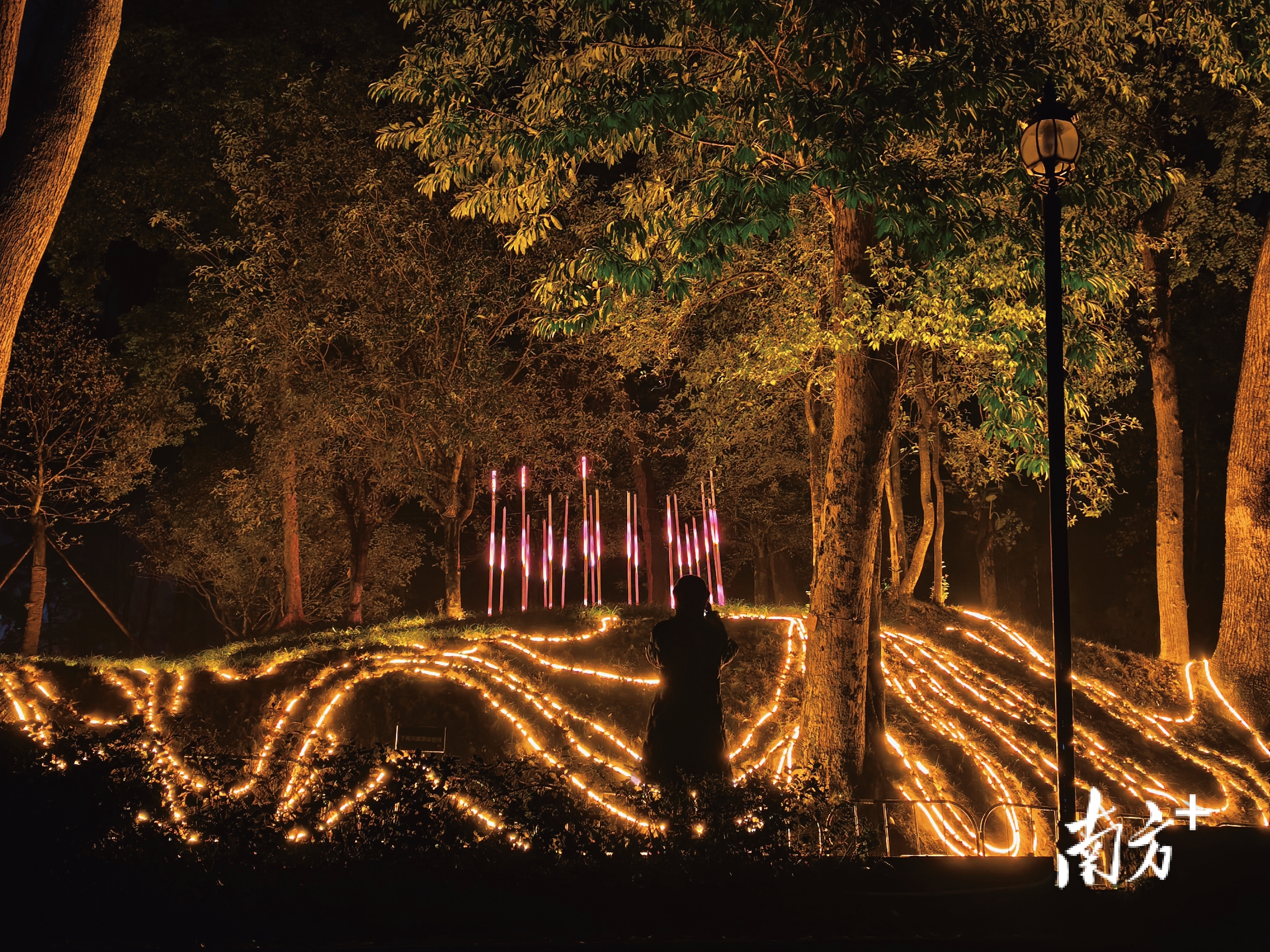 另一组作品《行愿树》则以南华寺内古树为载体,将光影与自然植被相融,灯光随游客脚步轻轻变化,仿佛古树焕发新生,传递出“行愿向善”的禅宗理念,让观者在静谧中感受文化的温润力量。