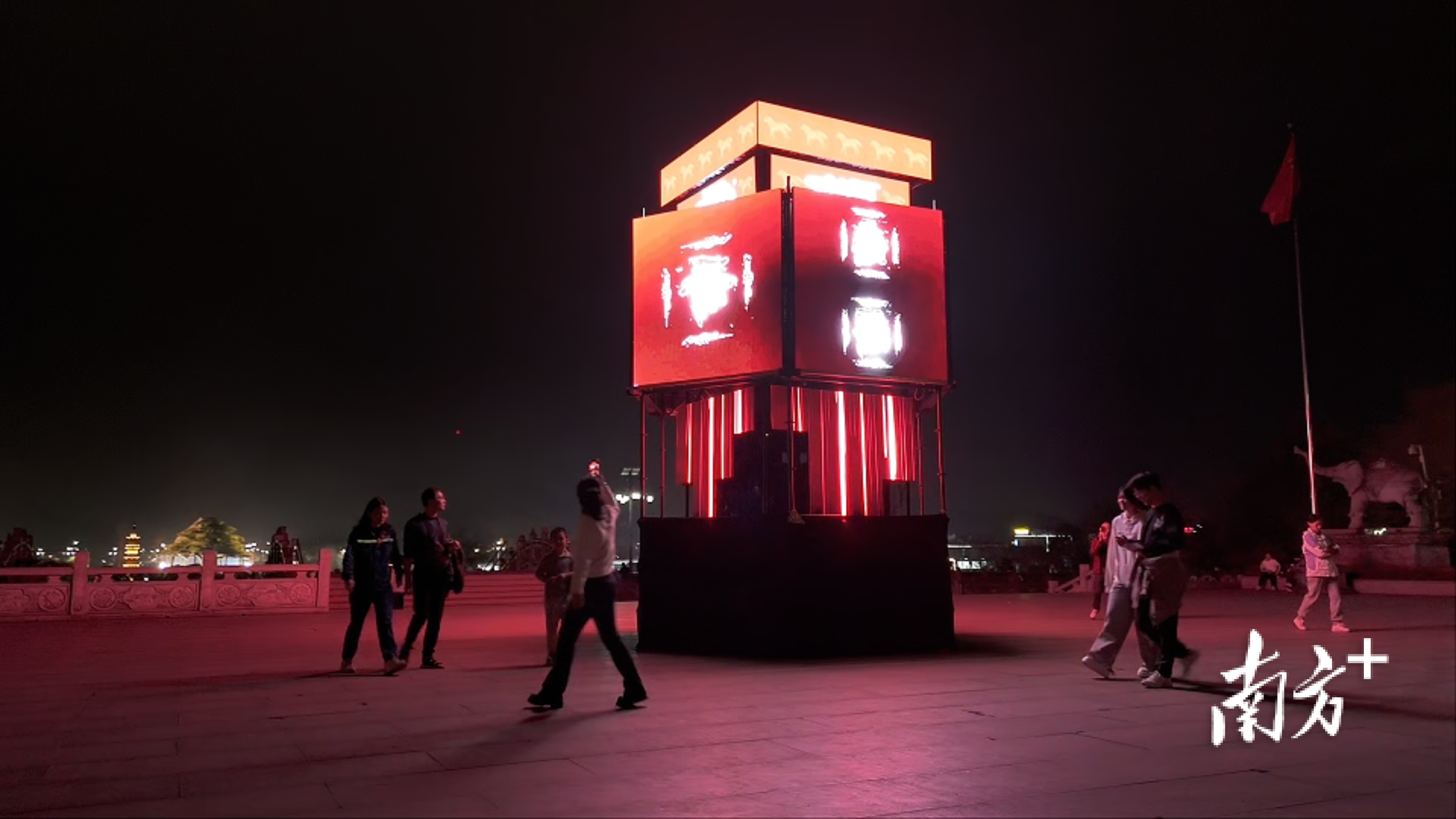 《南方》杂志记者了解到,活动由广州美术学院跨媒体艺术学院提供学术支持,陆豪教授担任总策划,团队围绕“传统空间如何以当代方式被理解”展开创作,推出多组特色光影作品,将禅宗文化、韶关地域文化融入细节,让游客在行走中感受传统文化的当代表达。其中,《心马归灯》作为核心作品之一,在寺门前投射出灵动的红色骏马剪影,搭配暖色调光影流转,既贴合马年新春氛围,又以简约设计诠释“心归禅境”的寓意,成为游客驻足打卡的热门点位,不少家庭在此合影留念,定格新春记忆。