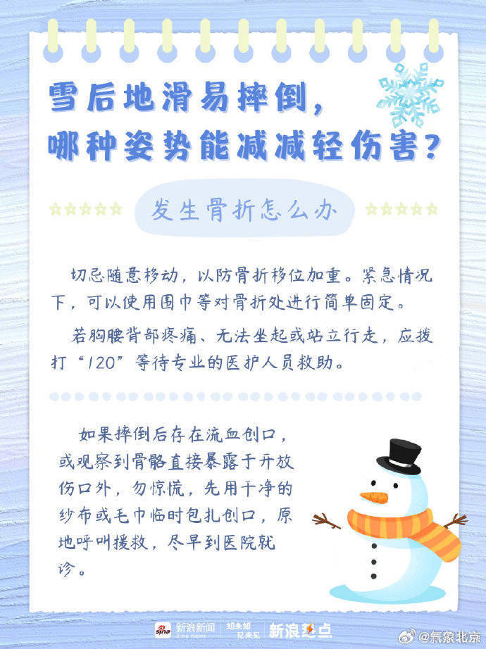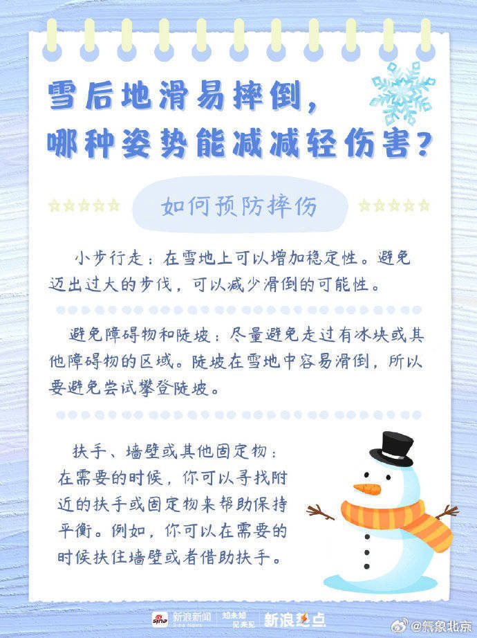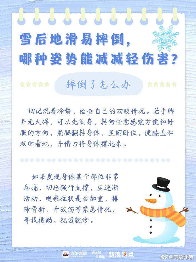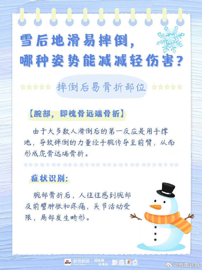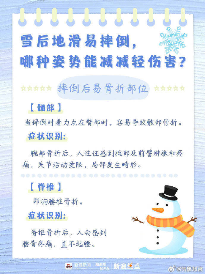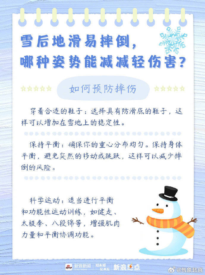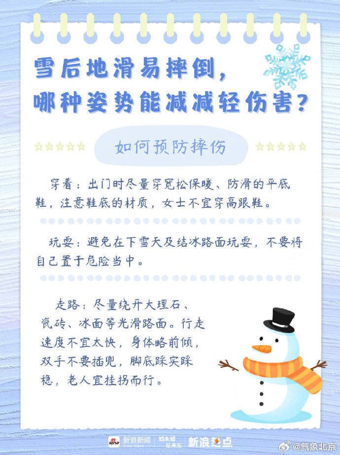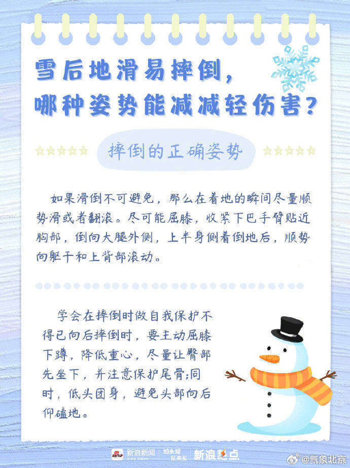 你知道雪天摔倒的正确姿势吗?北京今天迎来降雪。雪天路滑一不留神就可能摔倒,有的人可能拍拍屁股站起来没啥事,但有些人,特别是老年人,摔一跤就骨折了。万一不慎滑倒了,怎样将身体的损伤降到最低? 快来get雪天摔倒的正确姿势吧↓↓